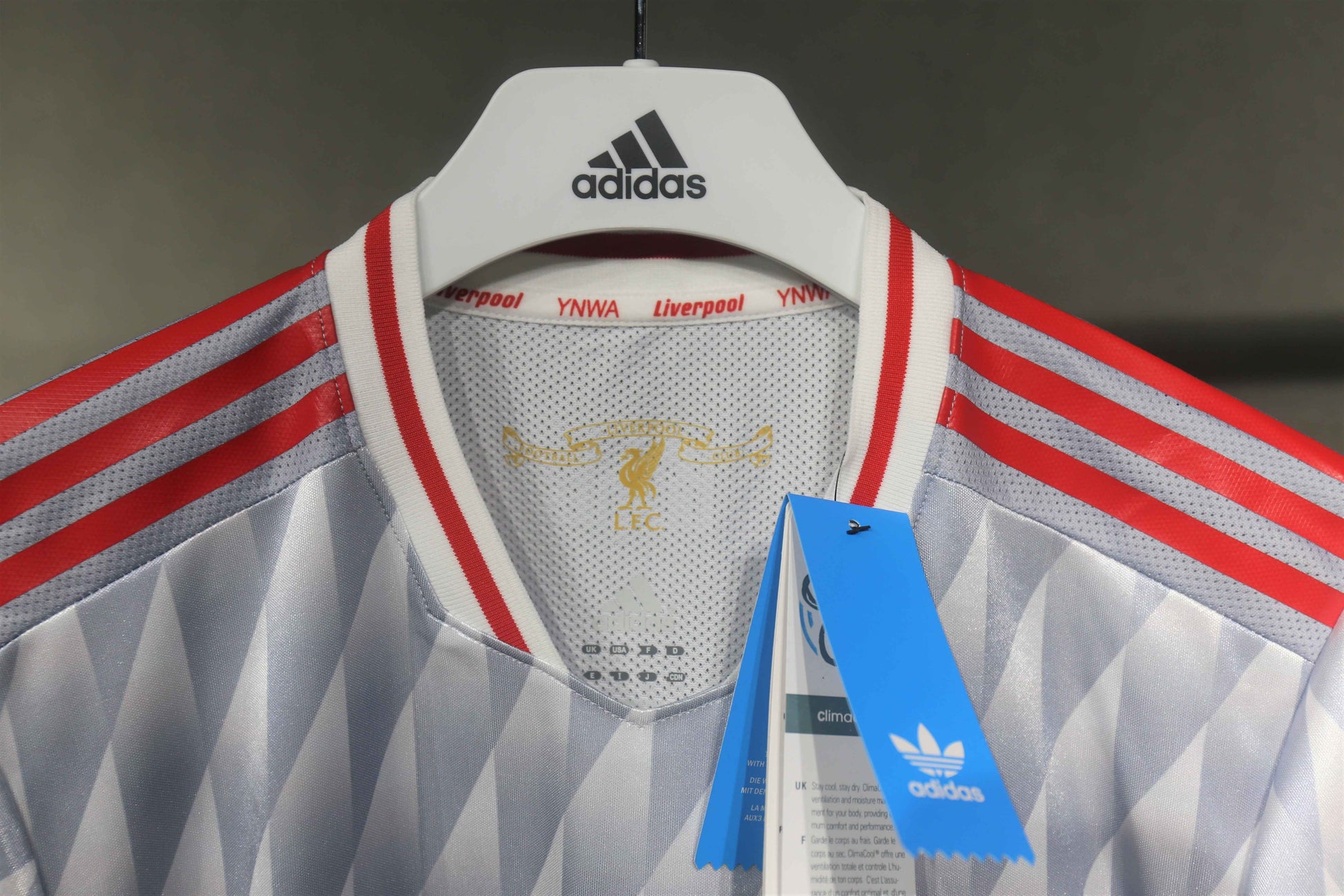 This unique jersey design features the traditional Liverpool Football Club's geometric pattern in light blue and white, showcasing the classic team style. Red details are added to the collar and cuffs, providing visual highlights. The front Carlsberg logo and club emblem further emphasize the jersey's brand collaboration and identity. The overall design preserves the club's traditional elements while incorporating the novelty of modern brand collaboration.